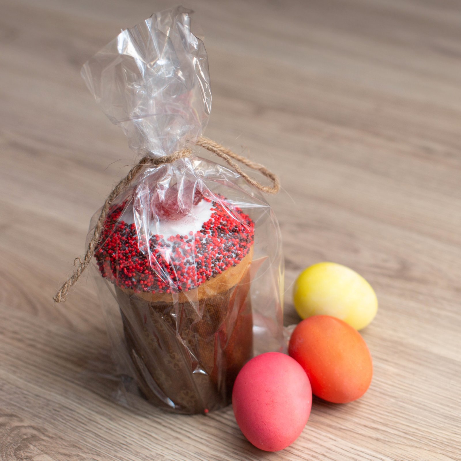 Поместите кулич в бумажной форме внутрь, перевяжите пакет ленточкой или просто завяжите в узел.