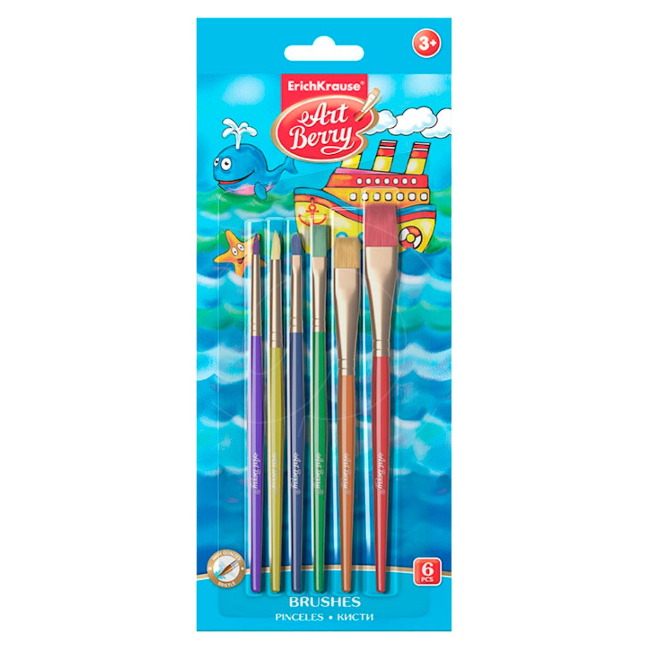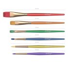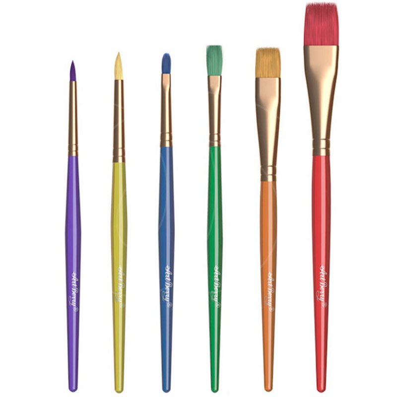 В набор входят шесть кистей с цветными ручками: две круглые и четыре плоские.
